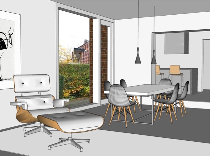 The new designed extension of the clients property provides a patio surrounded by a study and new dining area with reading corner. Cooking and dining are no longer separated anymore; a television room will derive and the living areas will get a better visual connection to the existing garden. The patio underlines this and provides late evening-sun to enter the dining area. The flooring will be made of polyurethane, build in furniture will be done in bright oak and the kitchen will be organized around a new kitchen island. The facade and terrace will be executed in dark brick, thereby the new extension optically melts with the existing property and it’s beautiful Dutch 1930’s architecture.
