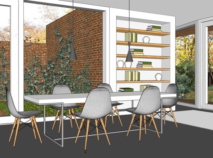 The new designed extension of the clients property provides a patio surrounded by a study and new dining area with reading corner. Cooking and dining are no longer separated anymore; a television room will derive and the living areas will get a better visual connection to the existing garden. The patio underlines this and provides late evening-sun to enter the dining area. The flooring will be made of polyurethane, build in furniture will be done in bright oak and the kitchen will be organized around a new kitchen island. The facade and terrace will be executed in dark brick, thereby the new extension optically melts with the existing property and it’s beautiful Dutch 1930’s architecture.