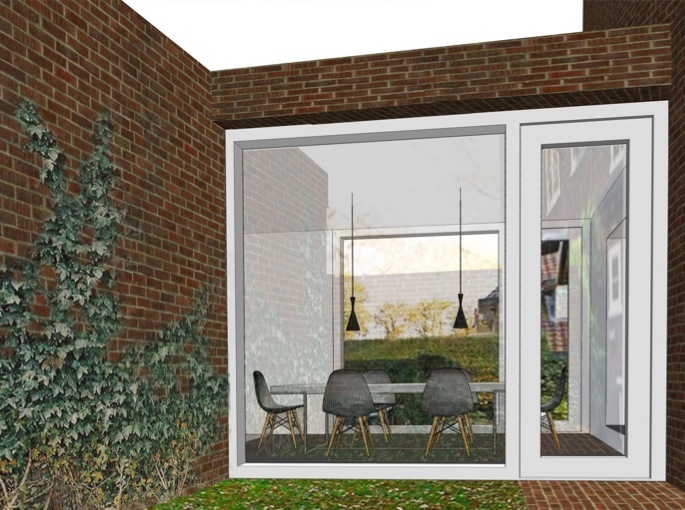 The new designed extension of the clients property provides a patio surrounded by a study and new dining area with reading corner. Cooking and dining are no longer separated anymore; a television room will derive and the living areas will get a better visual connection to the existing garden. The patio underlines this and provides late evening-sun to enter the dining area. The flooring will be made of polyurethane, build in furniture will be done in bright oak and the kitchen will be organized around a new kitchen island. The facade and terrace will be executed in dark brick, thereby the new extension optically melts with the existing property and it’s beautiful Dutch 1930’s architecture.