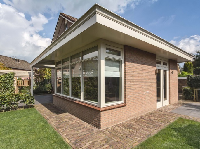 After a thoroughly reorganization and extension, the house became an open living space with long sight lines. The kitchen is repositioned in the center of the living space and the relation with the surrounding garden is intensified by opening up the facade with garden doors and a bow window. The roofed terrace is placed directly in front of the kitchen island, intensifying it relationship. The old kitchen is transformed into a study.