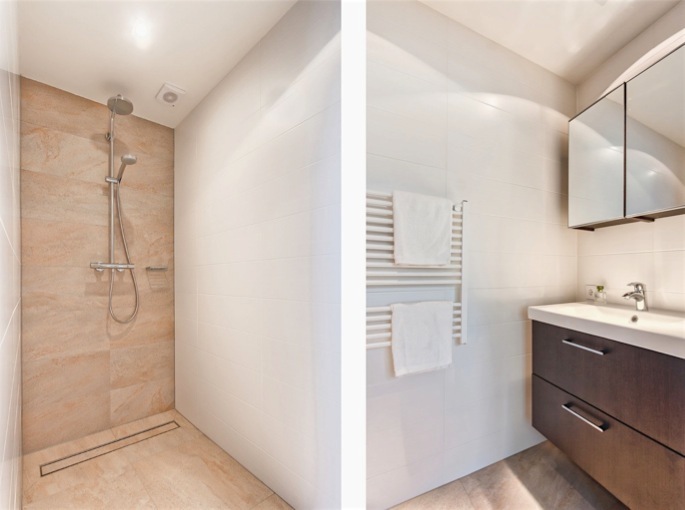 For providing a warm and cosy interior feel, a fireplace was installed, the ceiling beams exposed and a color palette for all surfaces had been chosen with brown based gray tones. These all matching the existing furniture of the client.