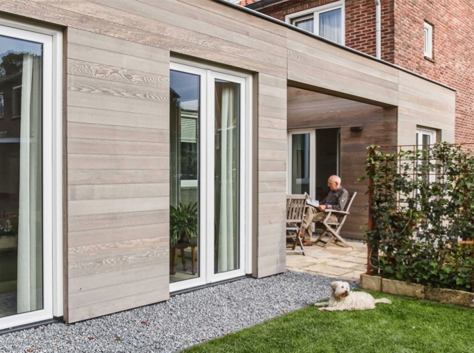The existing house has been isolated, the window frames have been replaced by up to date ones. The construction of the extension contains natural building materials: the timber frame construction is isolated with flex and wood fibre panels. The facade is covered with a grayish western red cedar, interior walls are covered with plasterboard and loam plaster operating as heat and humidity buffer. For the floor fine porcelain stoneware was chosen.