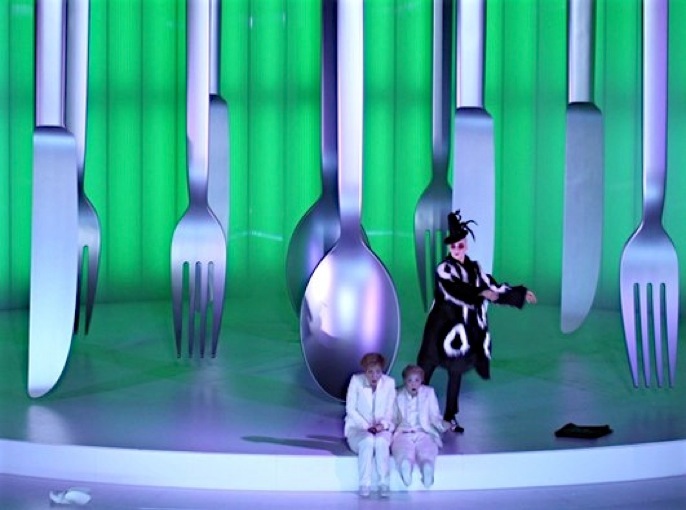 Due to their starvation H&G find themselves on the border of hallucination. The forest therefore turns into cutlery, and the which seduces them with a gigantic pie...