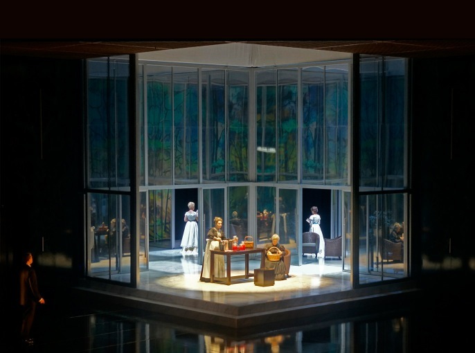 A lobby with marble walls in Rorschach pattern, a subtile reference to Onjegins personality, settle the play in modern day Russia. Spy-mirror foil on plexiglass in combination with projections make this stage design appearance change within a second. The winter garden by that operates as a time machine, commenting the play in the lobby.