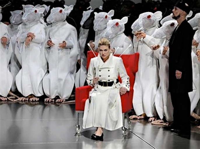 This Lohengrin experiment is located in a modern day laboratory in which the choir will transform itself on stage; from laboratory rats they turn more and more into humans. White leather walls, aluminum flooring and visible fluorescent tubes create a hypothermic atmosphere. Lohengrins swan appears in different dramaturgic settings, physiognomies and materials. Lohengrins and Elsas bridal chamber is designed far from intimate; their struggle for compassion is exhibited thoroughly...