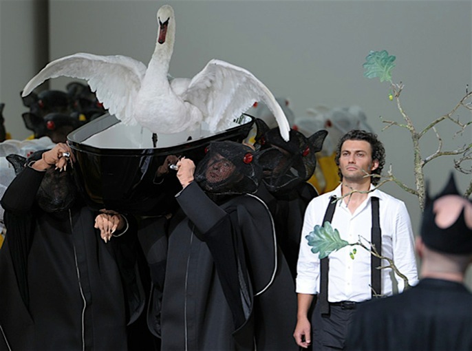This Lohengrin experiment is located in a modern day laboratory in which the choir will transform itself on stage; from laboratory rats they turn more and more into humans. White leather walls, aluminum flooring and visible fluorescent tubes create a hypothermic atmosphere. Lohengrins swan appears in different dramaturgic settings, physiognomies and materials. Lohengrins and Elsas bridal chamber is designed far from intimate; their struggle for compassion is exhibited thoroughly...