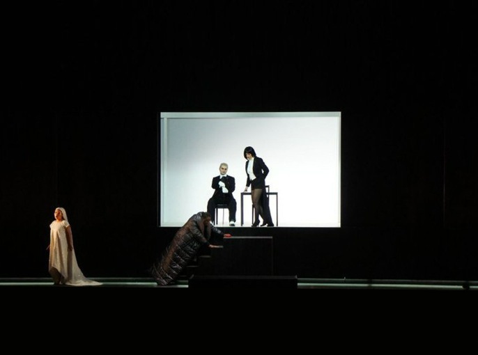 A massive minimalist wall directly behind the red curtain, charred and tarred wood, fog. Sliding walls opening up the inner life of this ‘war machine’ revealing a white increased horizontal excision and a red cabinet. The wall locates the play in the present without loosing the reference to the original setting and the former stages of Shakespeare. One big gesture in stead of the war ship, town wall and castle where this opera is originally located.